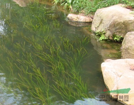苦草,別稱蓼萍草,扁草。為多年生無莖沉水草本,有匍匐莖。葉子呈線形或帶形,長20-200厘米,寬0.5-2厘米,綠色或略帶紫紅色,常具棕色條紋和斑點,先端圓鈍,邊緣全緣或具不明顯的細鋸齒,是雞鴨等家禽和許多鳥類以及小龍蝦的優(yōu)良飼料??嗖菟募境>G,耐寒,可以自然越冬。設計種植密度為9叢/m2。