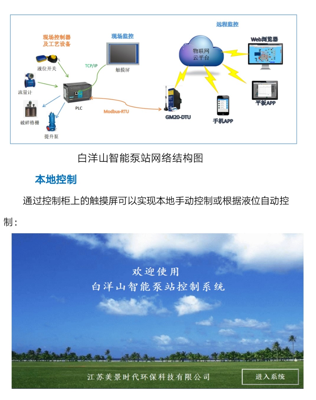 白洋山泵站控制方式分為兩種控制方式:現(xiàn)場觸摸屏控制方式以及云端控制方式(手機和WEB瀏覽器)。如下圖所示: