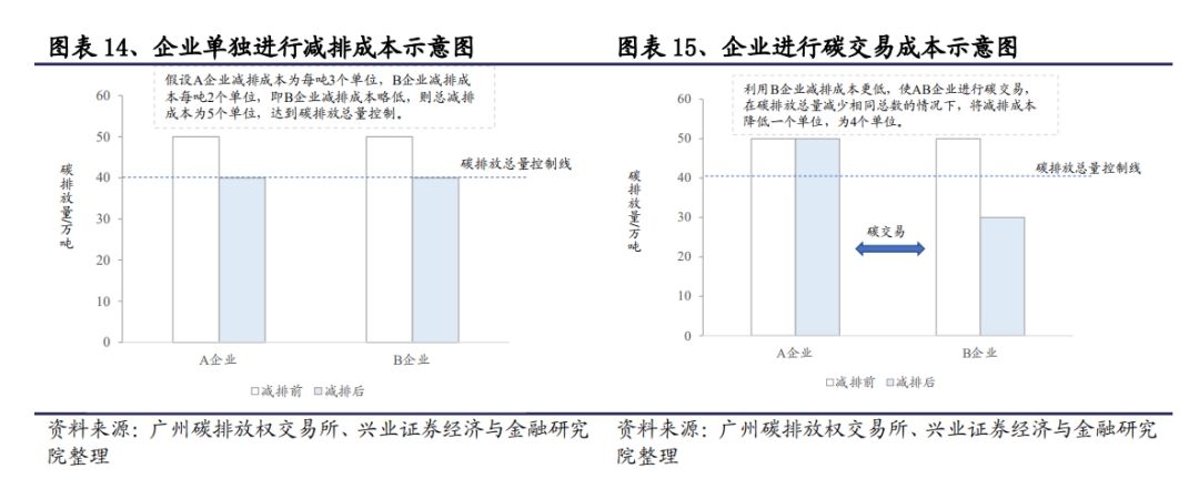 第一種情況,如果企業(yè)減排成本低于碳交易市場(chǎng)價(jià)時(shí),企業(yè)會(huì)選擇減排,減排產(chǎn)生的份額可以賣出從而獲得盈利;