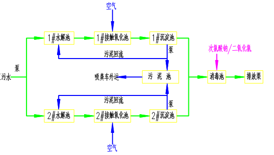 新落成的揚(yáng)州東方醫(yī)院污水處理設(shè)施采用如下的工藝流程,整個(gè)設(shè)施調(diào)試后實(shí)現(xiàn)遠(yuǎn)程操控,各系統(tǒng)的數(shù)據(jù)云端及時(shí)體現(xiàn),并且能夠做到無(wú)人值守。