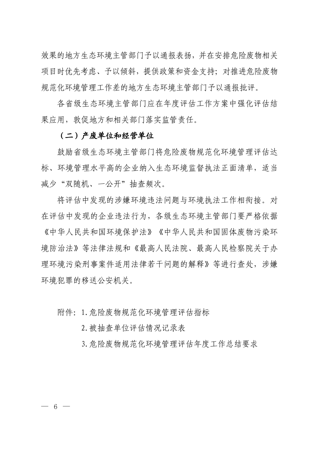 為貫徹落實《中華人民共和國固體廢物污染環(huán)境防治法》等法律法規(guī),按照《強化危險廢物監(jiān)管和利用處置能力改革實施方案》有關(guān)要求,加強危險廢物污染防治,鞏固和深化危險廢物規(guī)范化環(huán)境管理工作成效,進一步推動各級地方政府和相關(guān)部門落實危險廢物監(jiān)管職責,強化危險廢物監(jiān)管和利用處置能力,促進危險廢物產(chǎn)生單位和危險廢物經(jīng)營單位落實各項法律制度和相關(guān)標準規(guī)范,全面提升危險廢物規(guī)范化環(huán)境管理水平,有效防控危險廢物環(huán)境風險,我部組織制定了《“十四五”全國危險廢物規(guī)范化環(huán)境管理評估工作方案》?,F(xiàn)印發(fā)給你們,請遵照執(zhí)行。