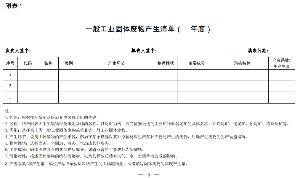 附表:1.一般工業(yè)固體廢物產(chǎn)生清單( 年度)