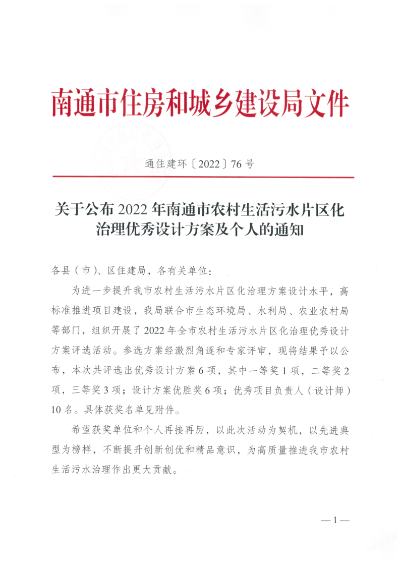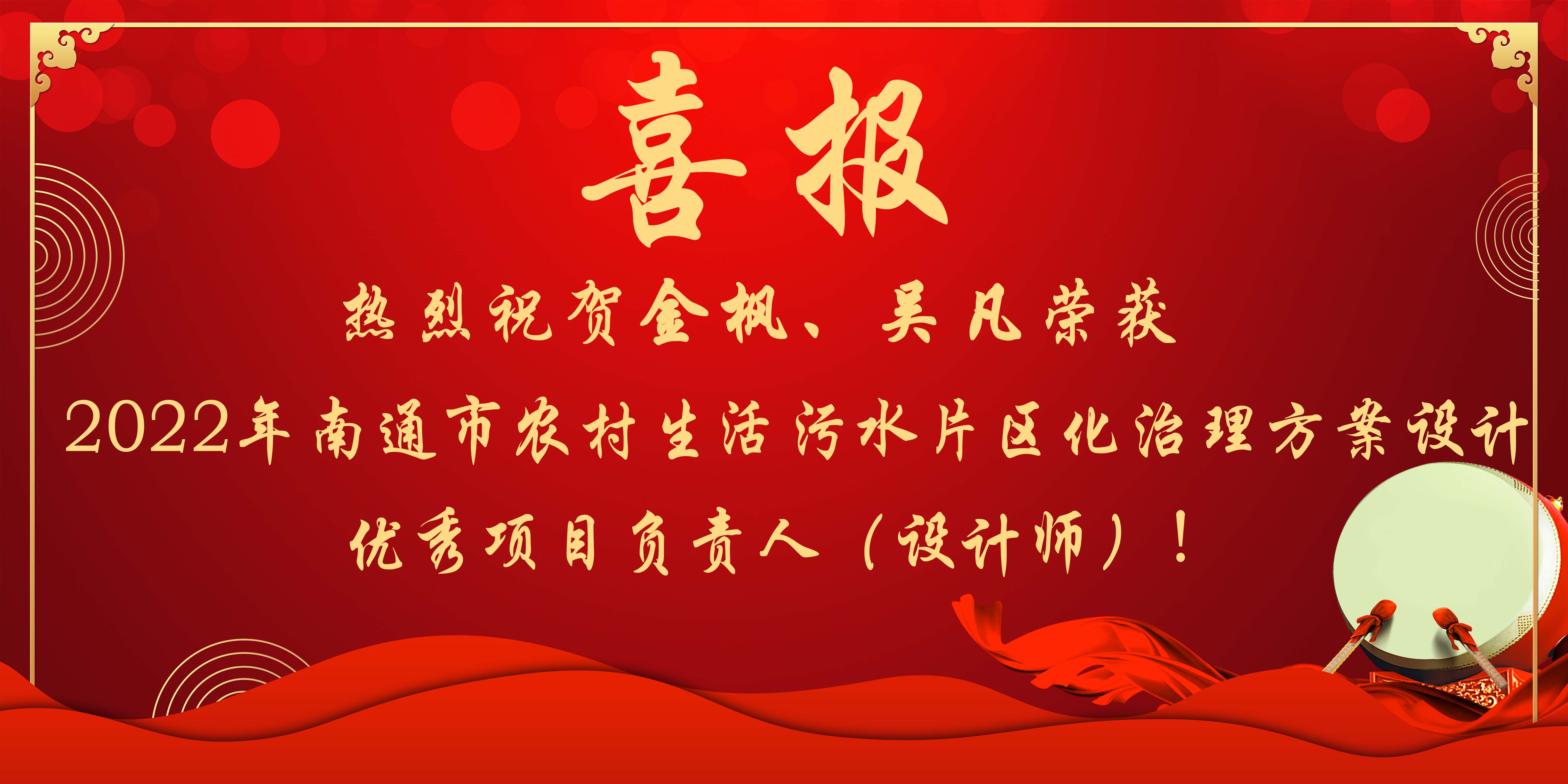 2022年4月,南通市住房和城鄉(xiāng)建設(shè)局聯(lián)合南通市生態(tài)環(huán)境局、水利局、農(nóng)業(yè)農(nóng)村等部門,組織開展了2022年全市農(nóng)村生活污水片區(qū)化治理優(yōu)秀設(shè)計(jì)方案評(píng)選活動(dòng),我司金楓、吳凡榮獲優(yōu)秀項(xiàng)目負(fù)責(zé)人(設(shè)計(jì)師),可喜可賀!